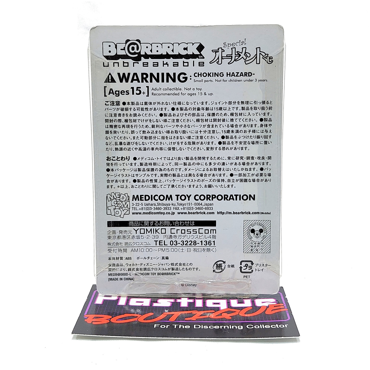 Released in November 2011 as part of a Bearbrick/Disney collaboration, these 100% figures were part of the “Special Ornament Happy Kuji” campaign. In Japan, Kuji (くじ) are Lottery Style contests wherein you have to purchase a “lottery ticket” to determine which figure you will receive from the set. The figure comes complete, and factory sealed on the card. The cards may show some signs of wear due to age/storage, but will still display fine if you choose to keep them sealed.