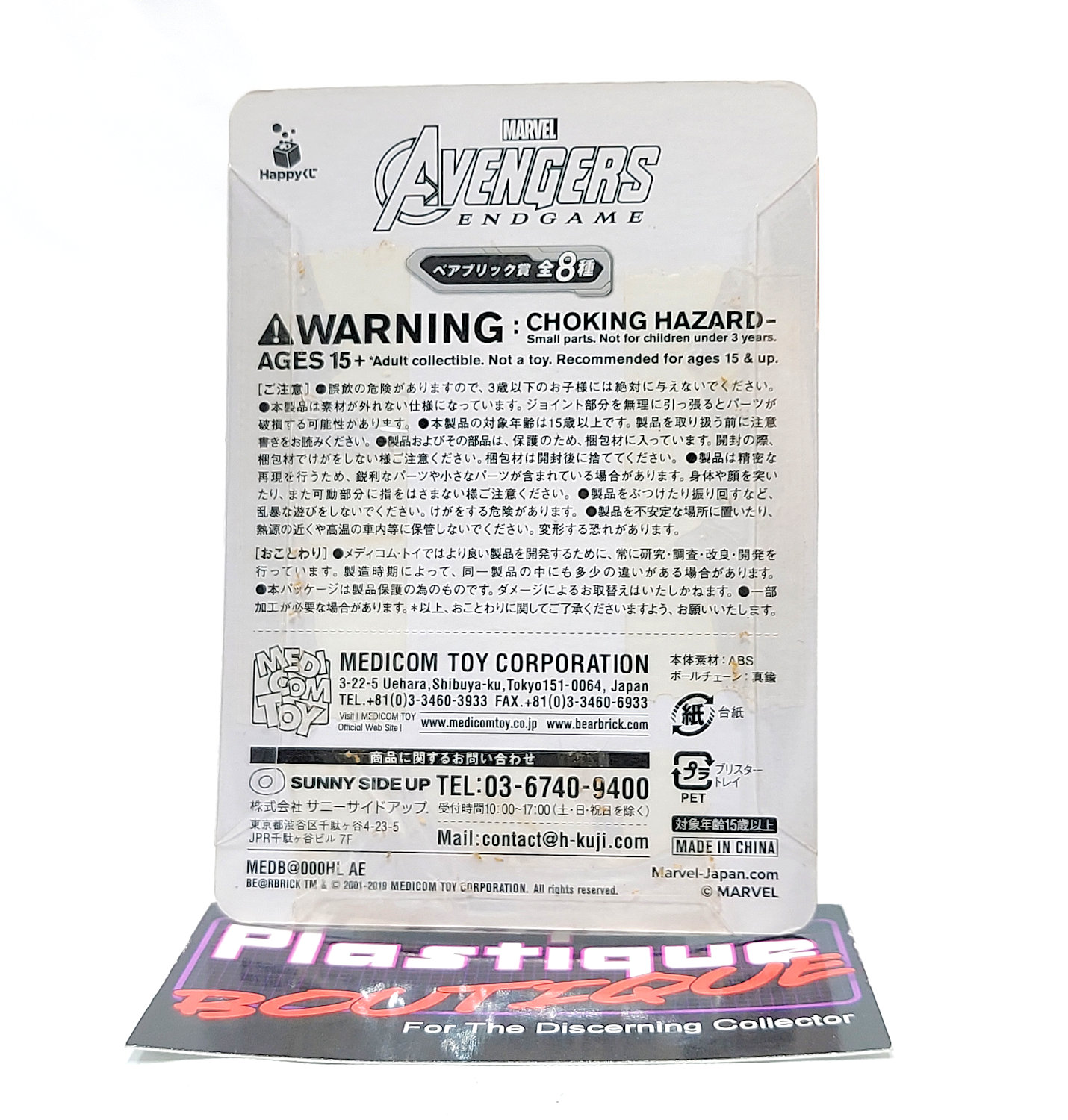 In a collaboration between Bearbrick & Marvel these 100% figures were released in May 2019 as part of a Happy Kuji campaign. Japanese Kuji (くじ) are Lottery Style contests wherein you have to purchase a “lottery ticket” to determine which figure you will receive from the set. The figure comes complete, and factory sealed on the card. The cards may show some sings of wear due to age/storage, however they will still display well if you choose to keep them sealed.