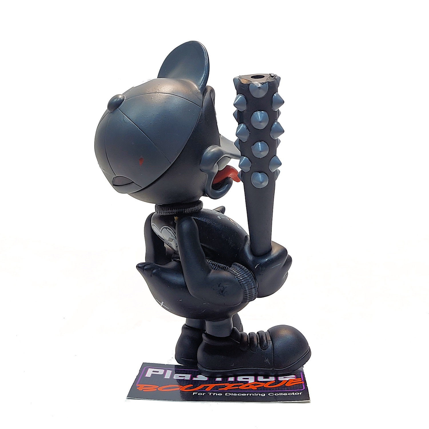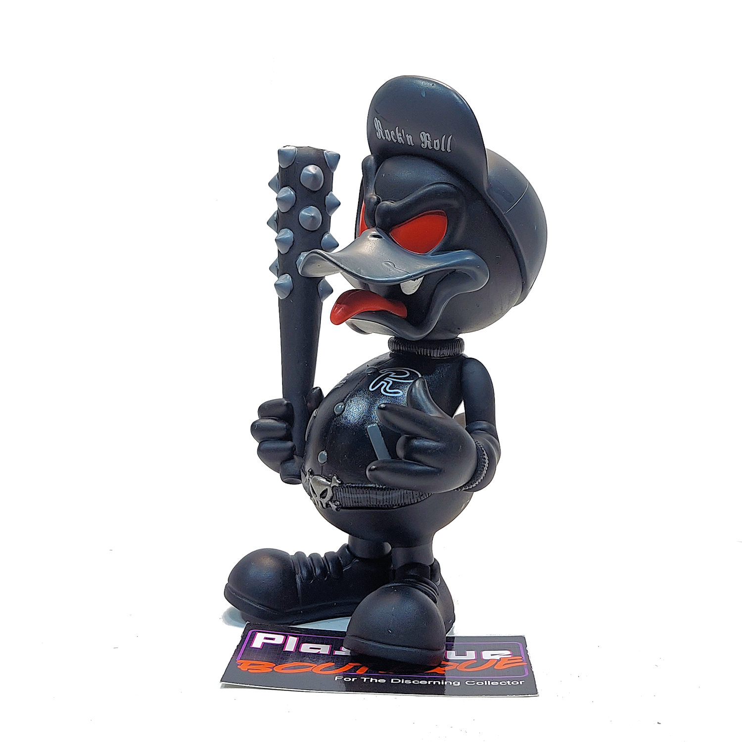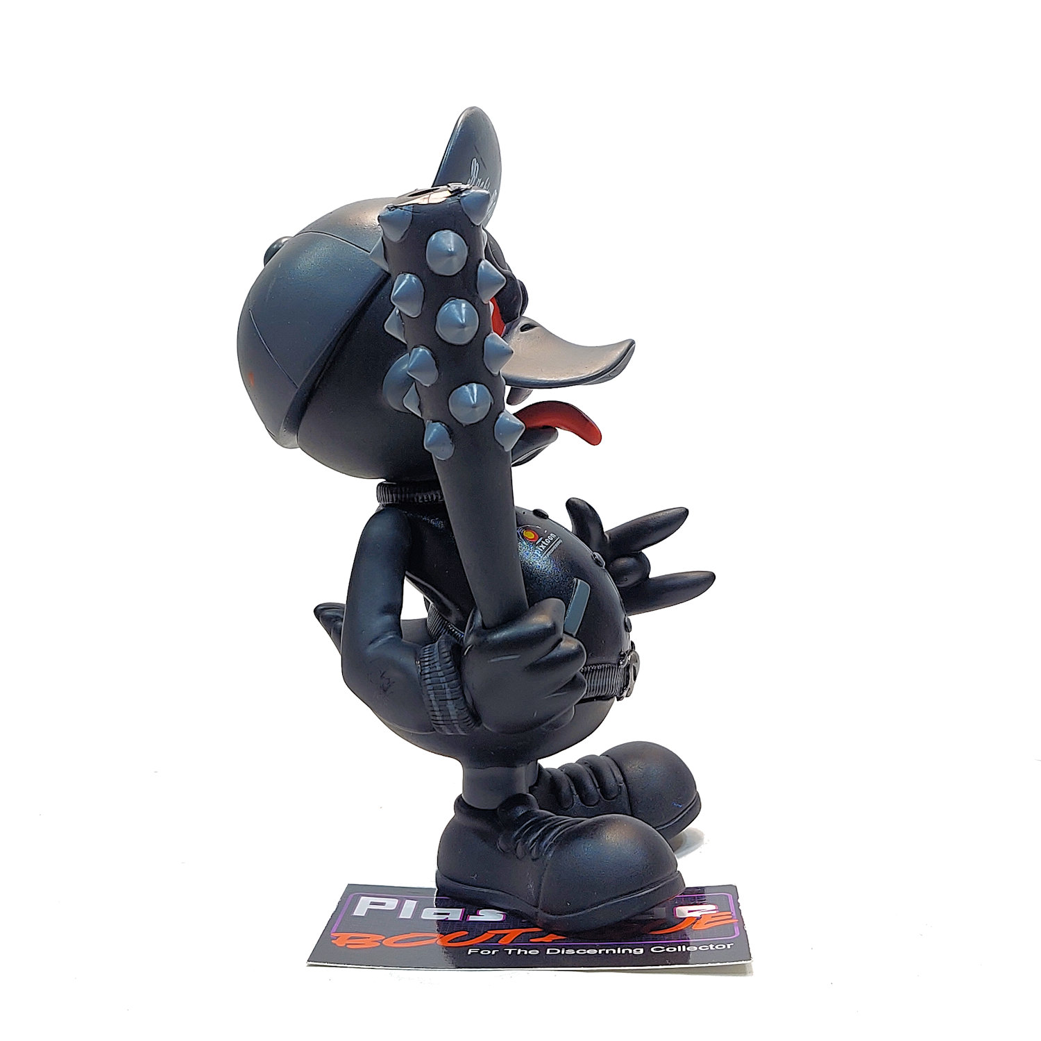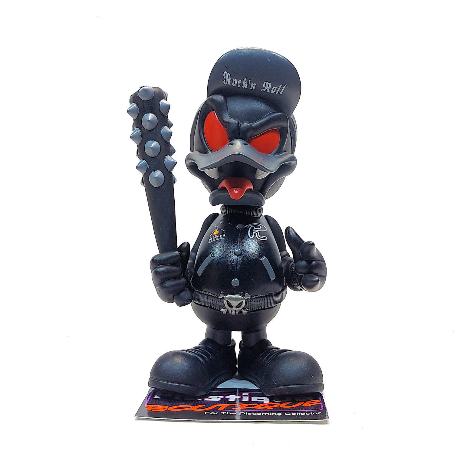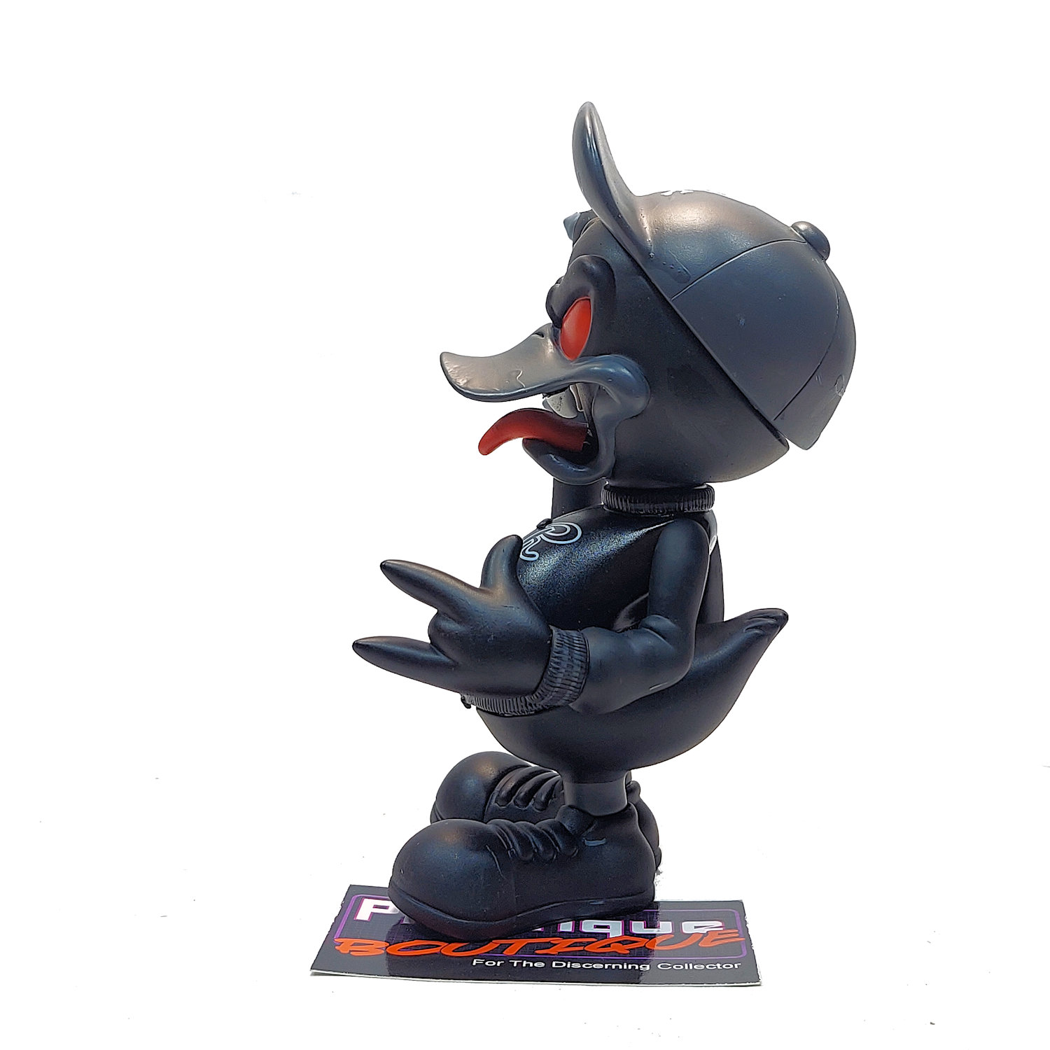 Released in the the early 2000’s, this figure was part of the Pixtoons line designed by urban artist Takumi Iwase in Japan. Takumi Iwase works under the name Tokyo Guns and is known for creating stylized, often edgy, designer vinyl figures and toys. These figures are known as collectible urban vinyl, with products sometimes self-produced or created with manufacturers like Flying Cat. The figures in this series draw inspiration from various pop culture icons reimagined with a punk or biker aesthetic, and as such this figure is often referred to as “Devil Duck” or “Devil Donald”.