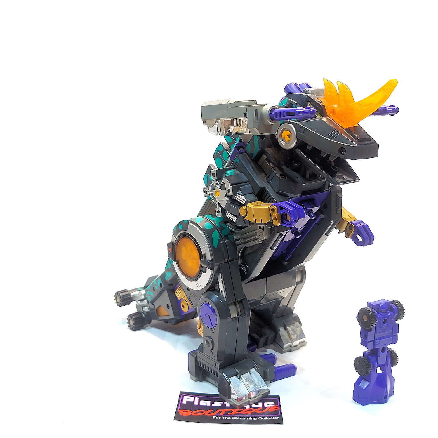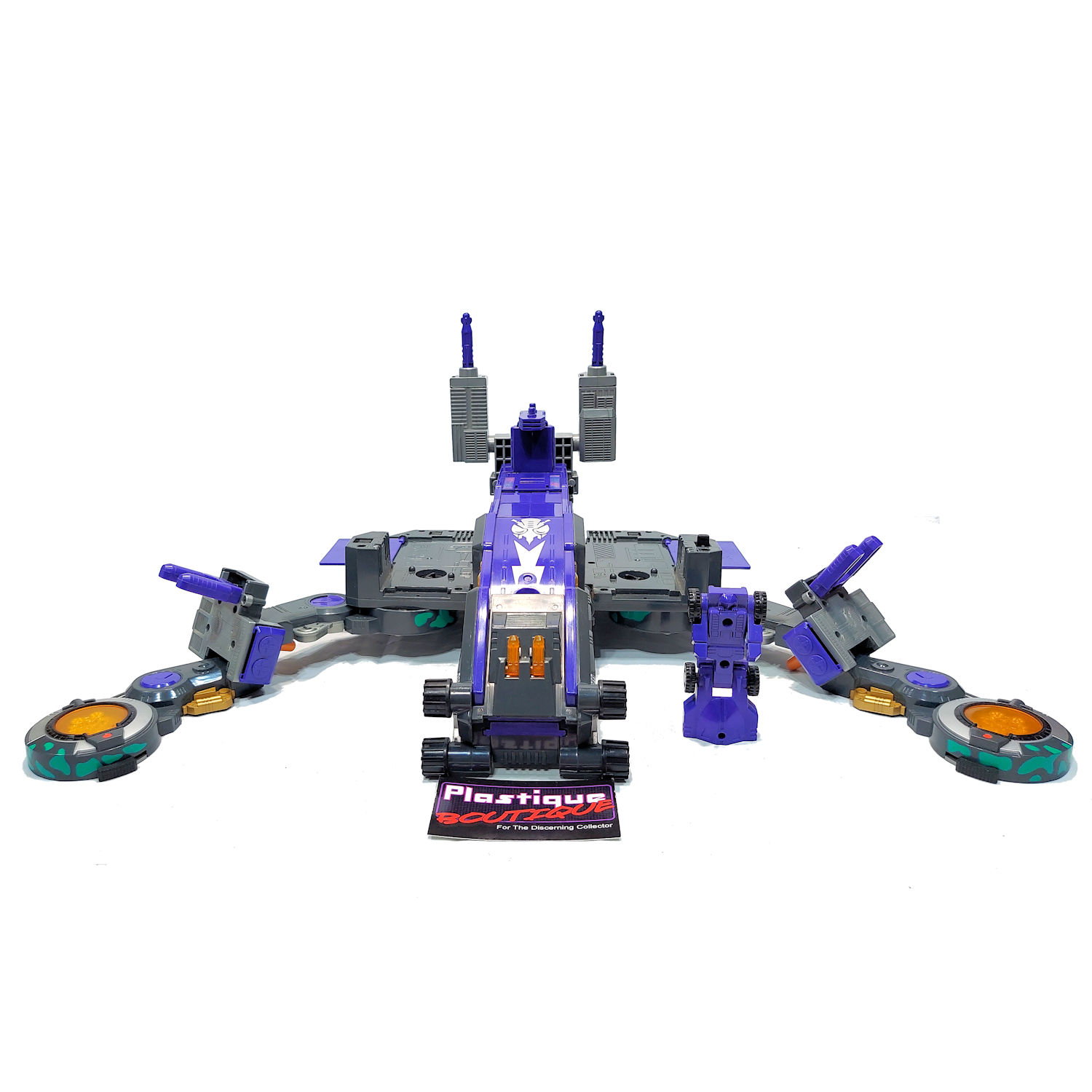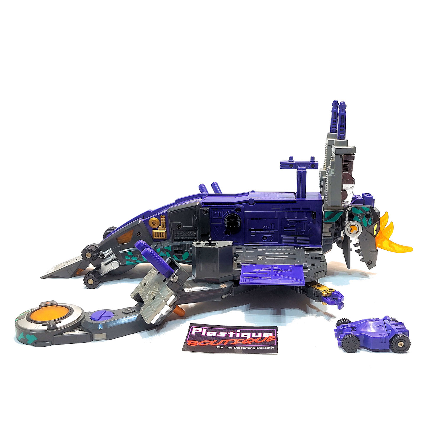 Released in 1998, Gigastorm is a repaint/remold of the original Generation 1 Trypticon figure. Gigastorm was released as part of the Beast Wars II toy line, which was only available in Japanese markets. The figure comes complete, however please note that it did not come with all of the accessories that Trypticon came with. The electronics have not been tested. This figure is a bit dusty and could probably use a cleaning. You will receive the exact figure in the pictures, these are not stock photos.