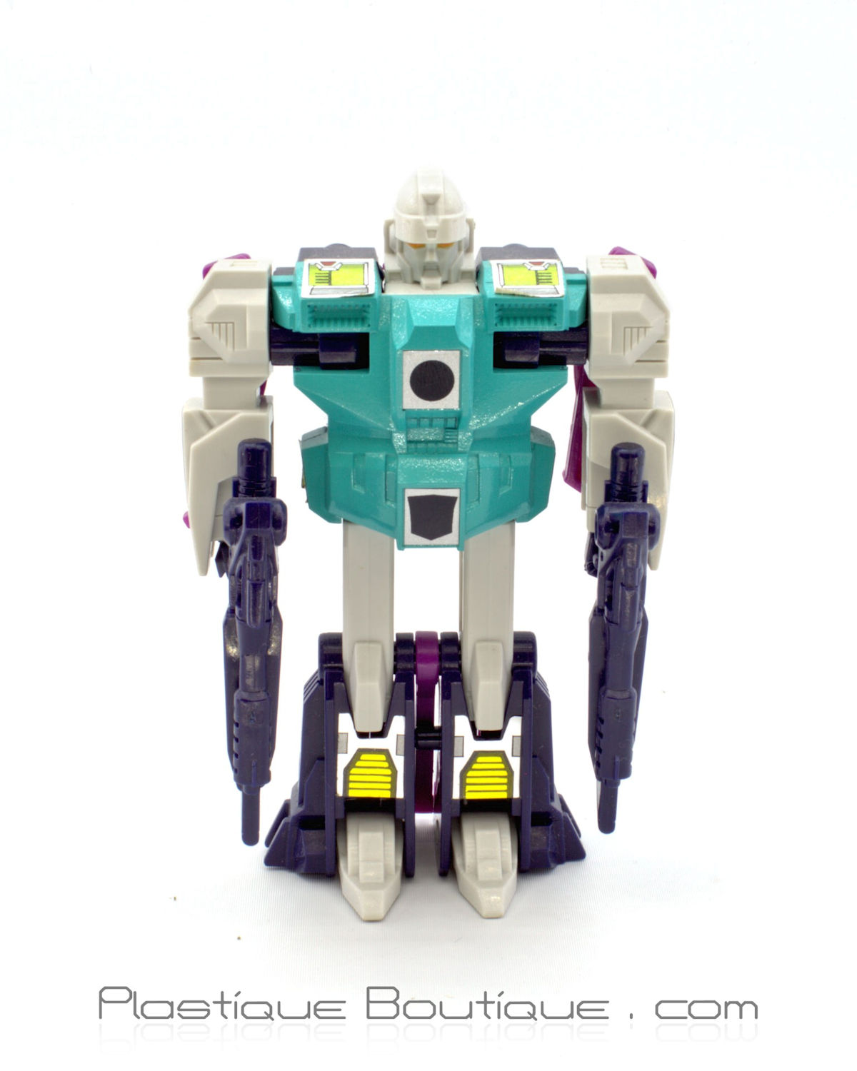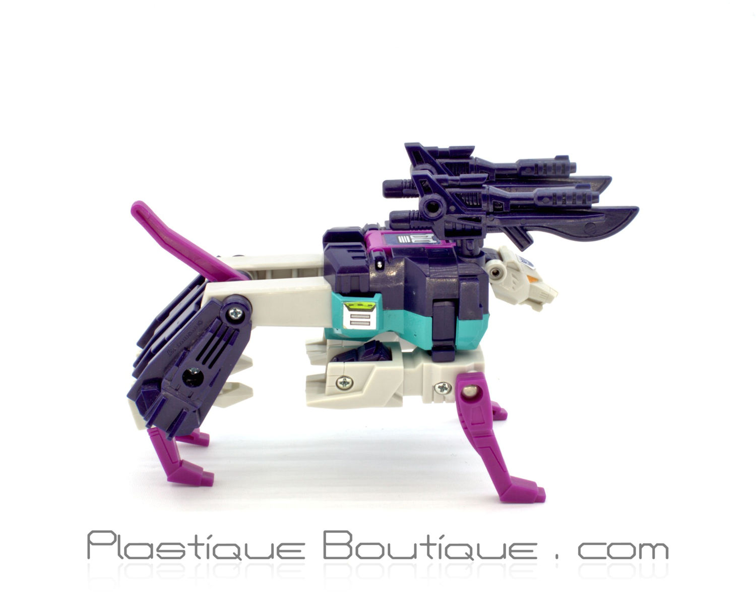 Released in the fourth year of Hasbro‘s US The Transformers toyline (third year in Europe and in Takara‘s Fight! Super Robot Lifeform Transformers line), Decepticon Clone Pounce tranforms into a robotic puma (at least, according to his bio). His robot mode is (mostly) identical to his Clone brother Wingspan (from the front at least). Pounce also has two heat-sensitive rubsigns on his torso: the one on his groin reveals the traditional Decepticon symbol, while the one on his chest reveals a puma head image, indicating which Clone he is. This is especially useful for those times when you can’t just turn him over and see the kitty legs on the backs of his limbs.