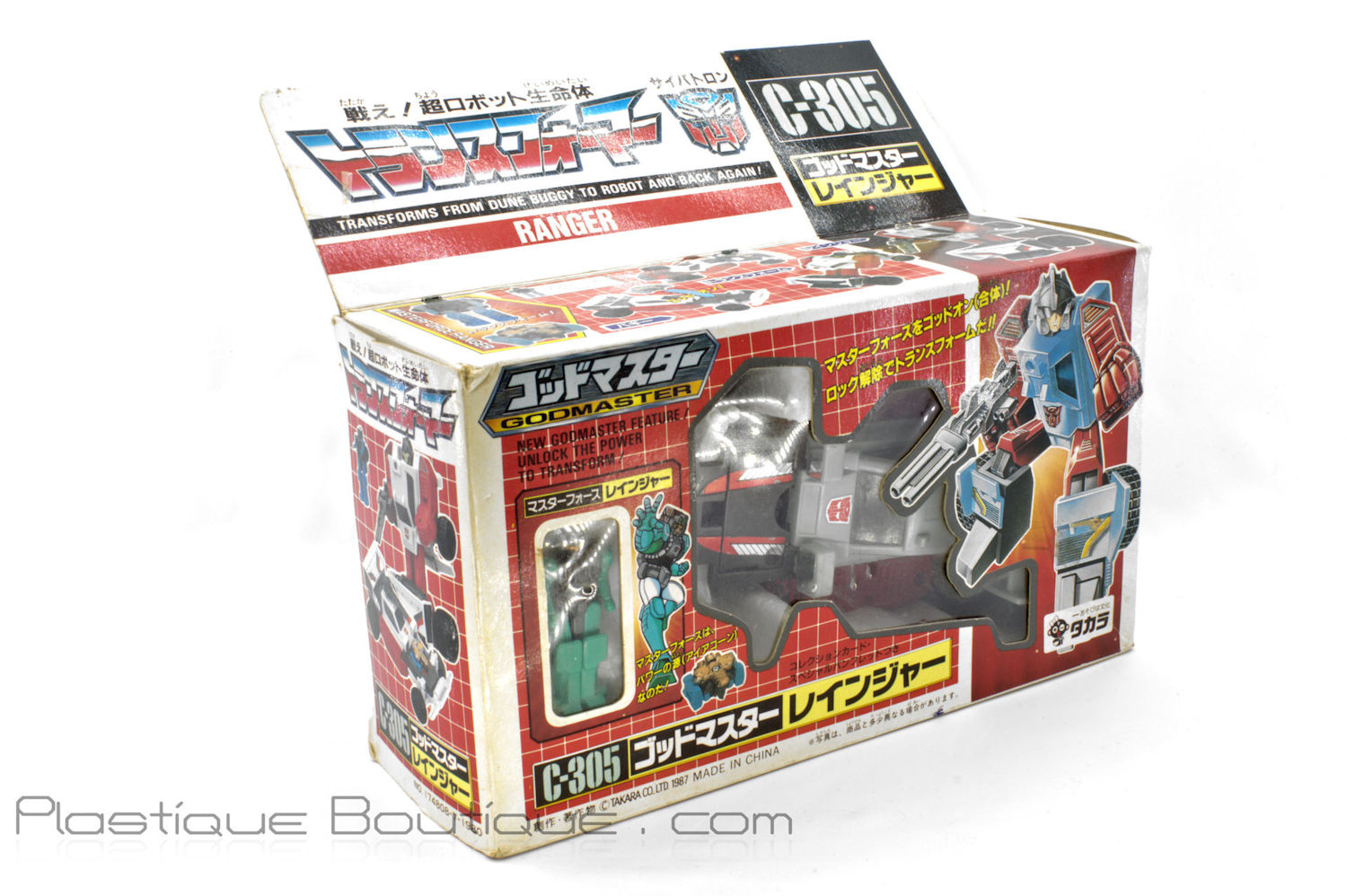 Released in the fourth year of Takara‘s Fight! Super Robot Lifeform Transformers line under the Super-God Masterforce banner, Godmaster Ranger is a redeco of the Hasbro Powermaster Nebulan Hotwire, transforming from armored humanoid into an engine block. In engine mode, he can plug into the engine socket of any larger Godmaster/Powermaster toy, unlocking their transformation or other gimmicks.