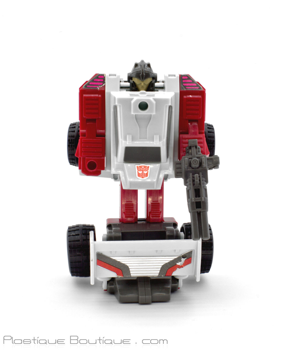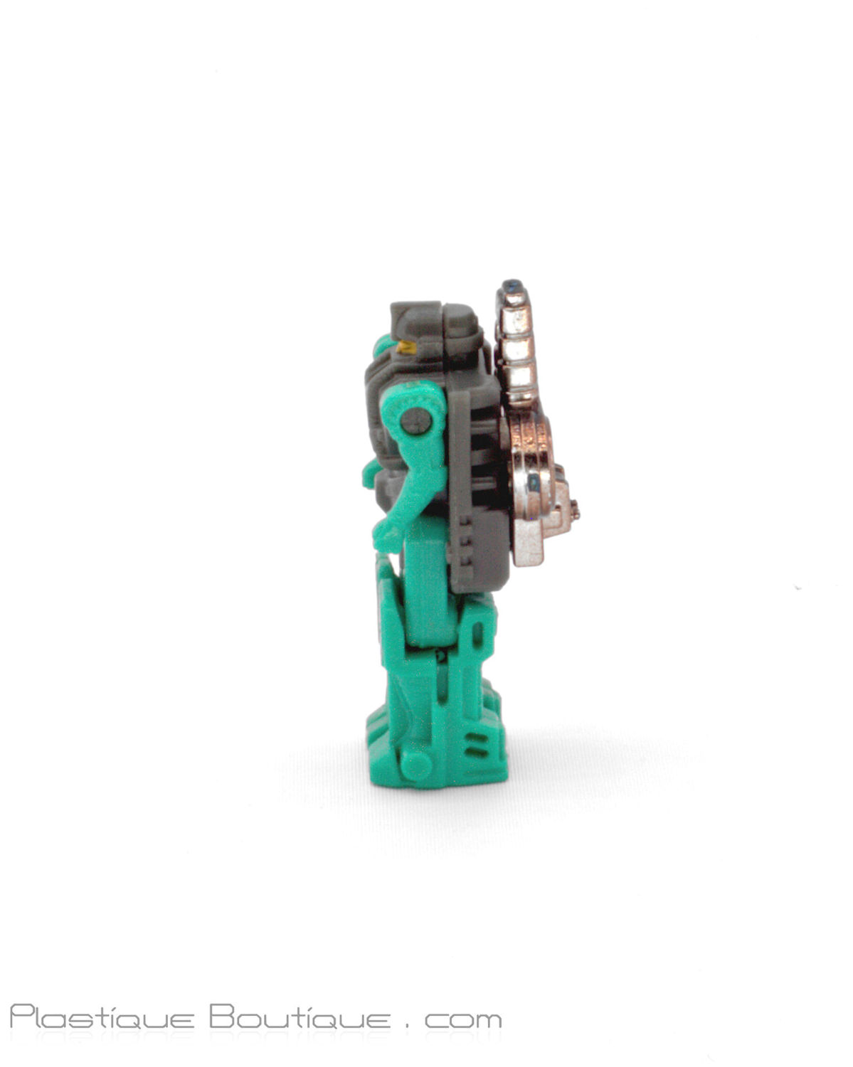 Ranger’s Transtector is a hyper-light-blue and red redeco of Hasbro’s Joyride, transforming into a baja buggy, which, like any Godmaster, cannot transform into robot mode until a Godmaster/Powermaster figure in engine mode and snapped into place in the toy’s chassis. (Or you can just press the tiny release button via some other method. The engine method is easier on the fingertips though.) The roof of the buggy mode has a 5 mm post-hole to mount the “Napalm Blaster” rifle.