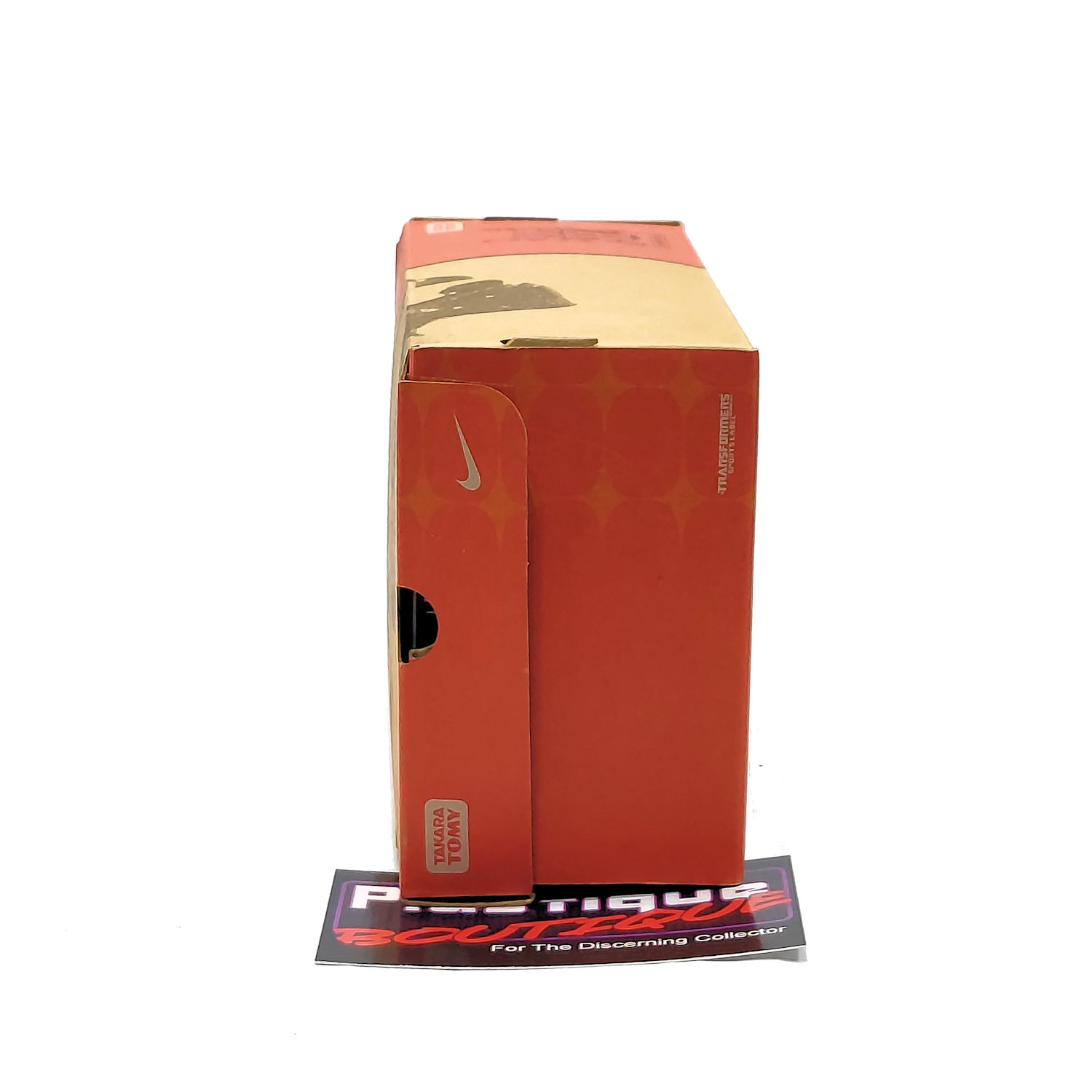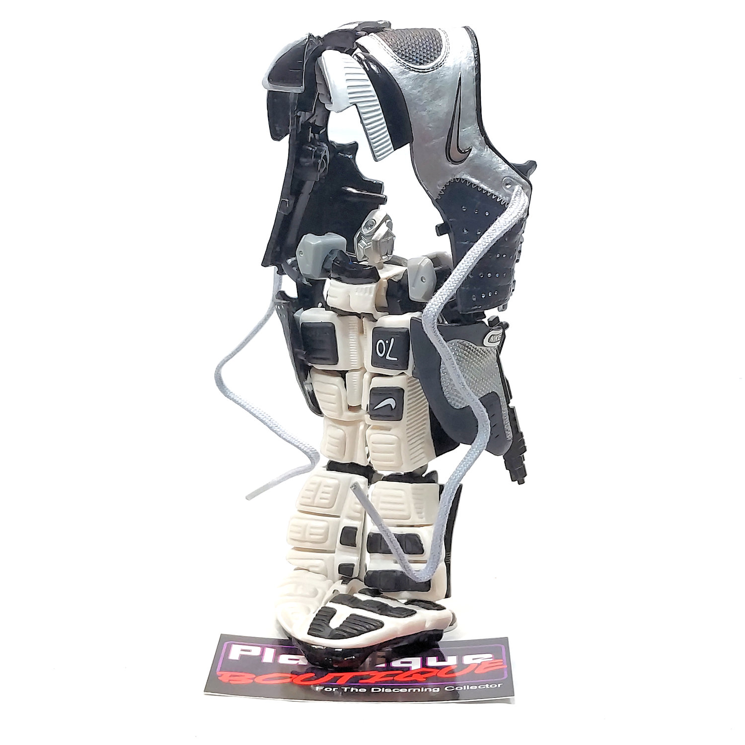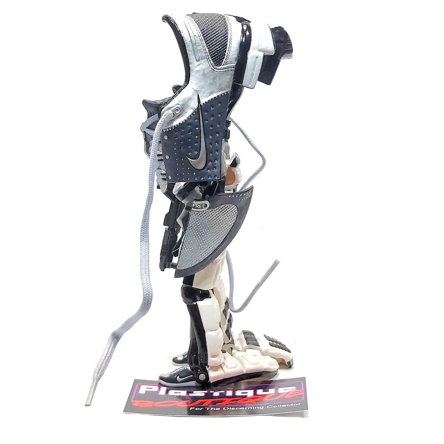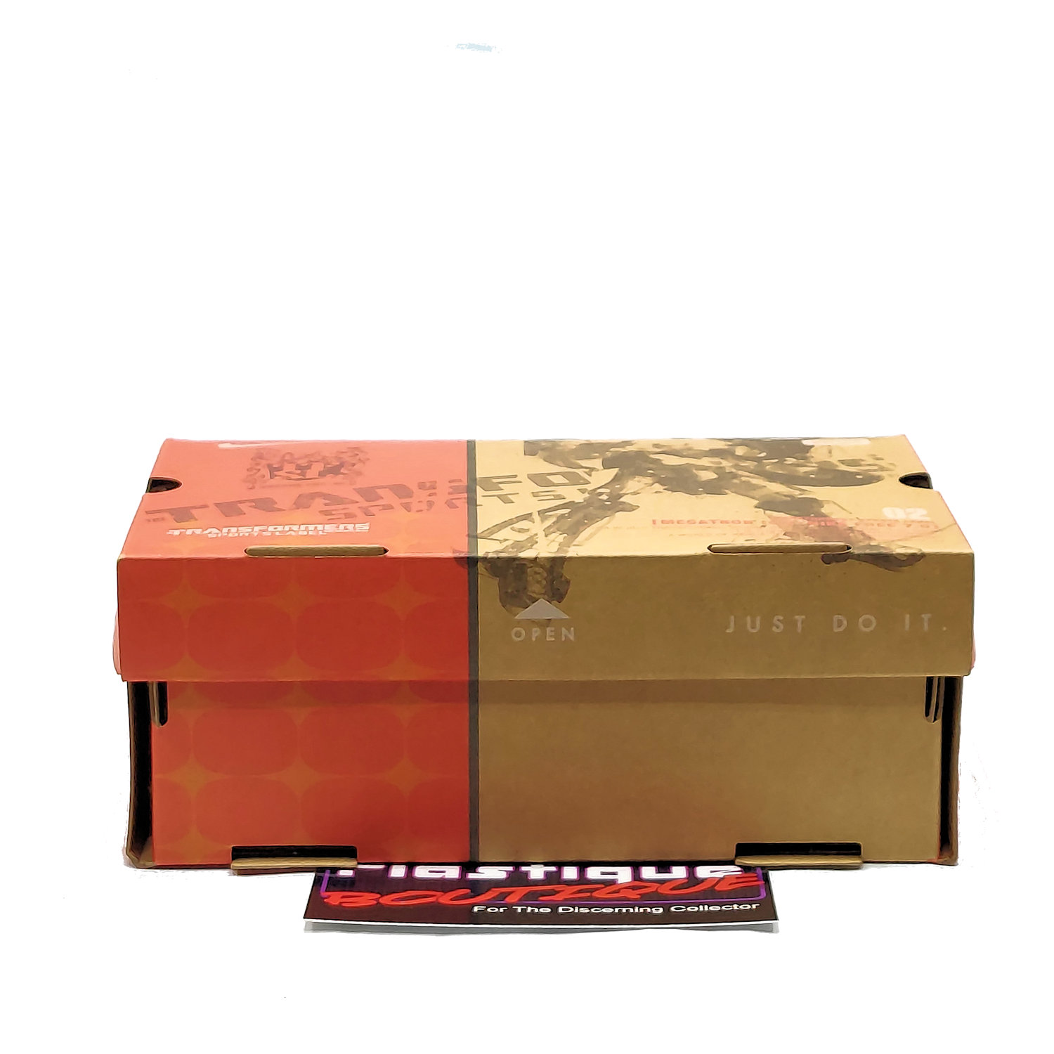 Sports Label Megatron is a retool of Sports Label Convoy, one of the strangest examples of licensed Transformers products in that he transforms into a shoe. Something of a shellformer, this baffling incarnation of Megatron is primarily black and silver in his alternate mode as a realistic-looking (if notably undersized) Nike Free 7.0 sneaker, complete with gratuitously long real fabric shoelaces (characterized as “electrical discharge cables” in his bio). In robot mode, he sports some additional red paint applications and a somewhat uniquely-shaped yet instantly recognizable Generation 1-inspired head. Also in this mode, Megatron’s feet are sculpted in the likeness of his own sneaker mode, making it seem like he’s wearing himself!
