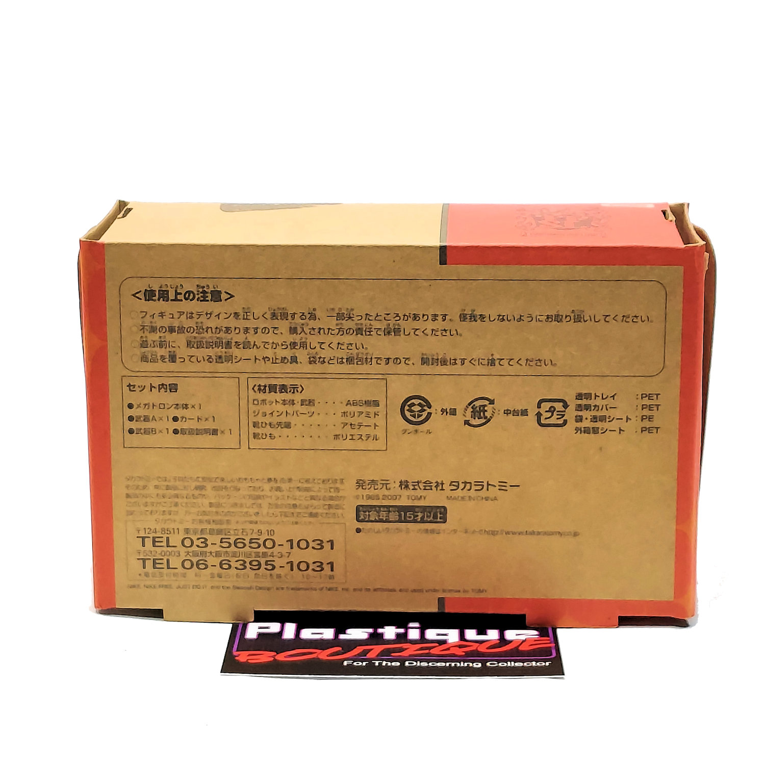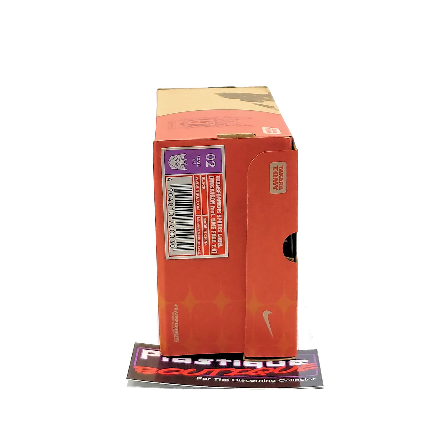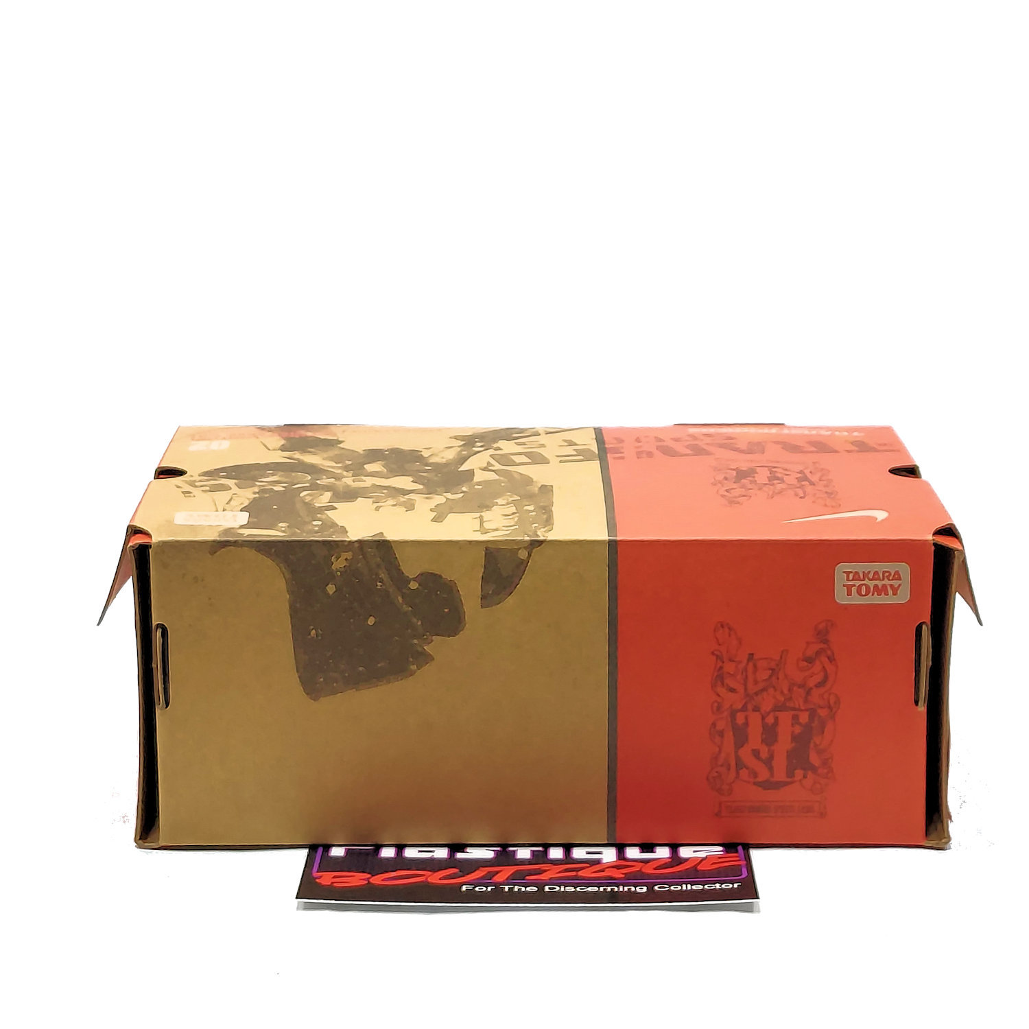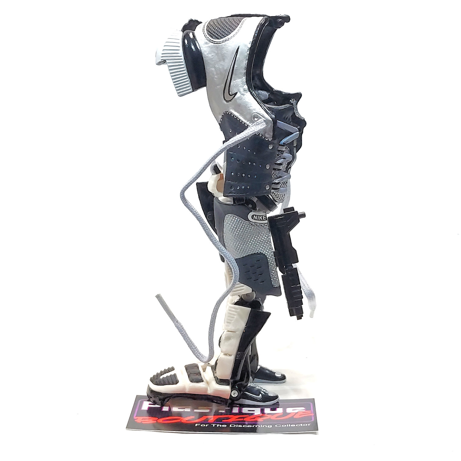 Sports Label Megatron is a retool of Sports Label Convoy, one of the strangest examples of licensed Transformers products in that he transforms into a shoe. Something of a shellformer, this baffling incarnation of Megatron is primarily black and silver in his alternate mode as a realistic-looking (if notably undersized) Nike Free 7.0 sneaker, complete with gratuitously long real fabric shoelaces (characterized as “electrical discharge cables” in his bio). In robot mode, he sports some additional red paint applications and a somewhat uniquely-shaped yet instantly recognizable Generation 1-inspired head. Also in this mode, Megatron’s feet are sculpted in the likeness of his own sneaker mode, making it seem like he’s wearing himself!